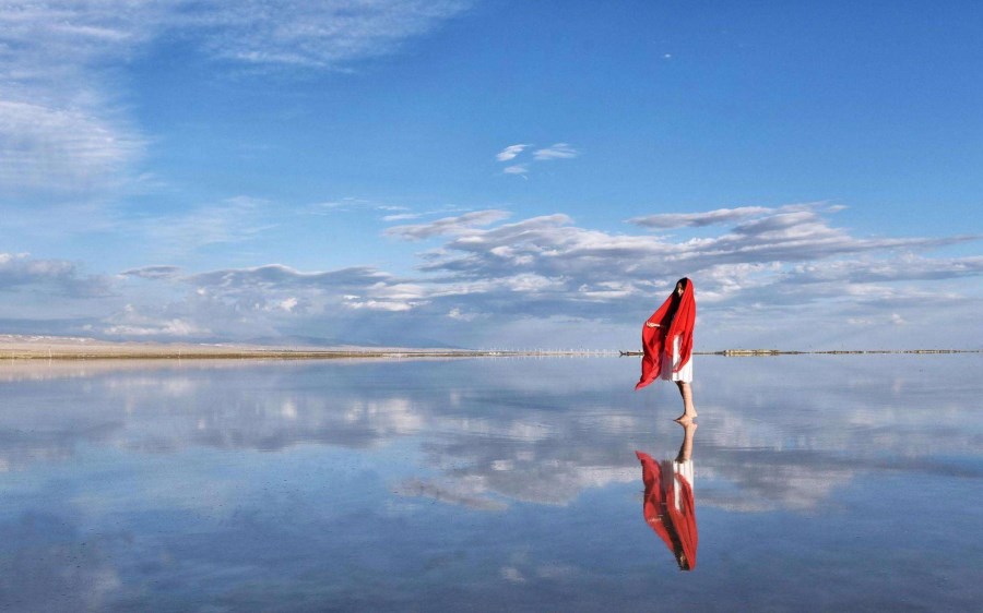 在国内也有一处与乌尤尼如出一辙的神奇湖泊,那就是茶卡——青海湖边的一个高原盐湖,它镶嵌在雪山与草地之间。盐湖水域宽广,银波粼粼,天空白云悠 悠,远处苍山峥嵘,蓝天白云、雪山映入湖中,如诗如画。四周牧草如茵,羊群似珍珠洒落,漫步在湖上,犹如漫步在天空。被国家旅游地理杂志评为“人一生必去的55个地方”之一。