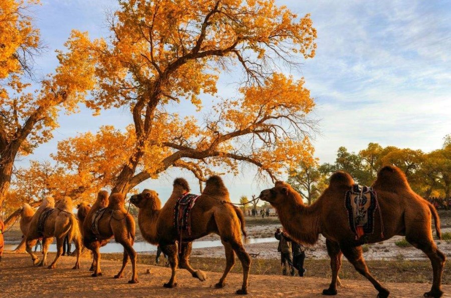 额济纳继承了整个阿拉善地区的传统, 拥有健壮挺拔的双峰骆驼。额济纳胡杨林自然保护区内的八道桥沙漠景区,是骑骆驼的好地方。花上不到一百元,你就可以骑在骆驼的双峰之间,行走在一望无际的沙漠之上,迎面吹来风沙,仿佛还能听到低沉苍茫的笛声,自己好像变身为当年行走丝绸之路的商人,在骆驼背上感受着千百年历史的风霜。