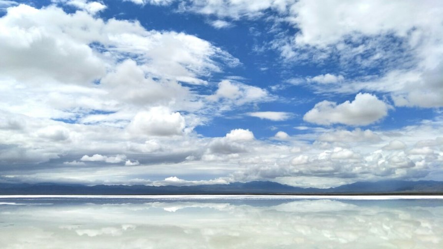 亿万年结成的盐晶静静的躺在茶卡,整个湖泊变成一面巨大的镜子,映照天空的白云悠悠,映照苍山的若现峥嵘,映照前行者的姿态容颜。