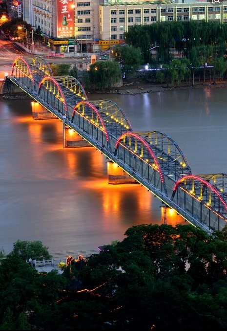 位于兰州城北的白塔山下、金城关前,有"天下黄河第一桥"之称,是兰州市内标志性建筑之一。铁桥建成之前,这里设有浮桥横渡黄河。浮桥始建于明洪武年间,名叫镇远桥,今尚存建桥所用铁柱一根高达三米,重约数吨,上有"洪武九年"字样。清光绪三十三年,改浮桥为铁桥,是黄河上游第一座铁桥。桥有四墩,下用水泥铁柱,上用石块,弧形钢架拱梁,是后来进行加固工程时增建的,全部工程共耗白银30余万两。登桥远望,不远处的黄河如带,蜿蜒盘曲,为兰州这一工业城市增色不少。