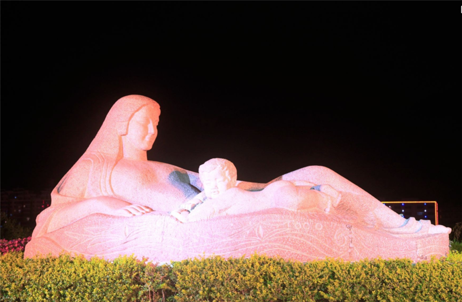 雕塑由甘肃著名的雕塑家何鄂女士创作,由“母亲”和一“男婴”组成构图,分别象征了哺育中华民族生生不息、不屈不挠的黄河母亲,和快乐幸福、茁壮成长的华夏子孙。 该雕塑构图简洁,寓意深刻,反映了甘肃悠远的历史文化。雕塑下基座上刻有水波纹和鱼纹图案,源自甘肃古老彩陶的原始图案。同时,水波纹和鱼纹也反映了黄河流域的先民们对自然现象敏锐的观察力,说明了中国人内在的实力。