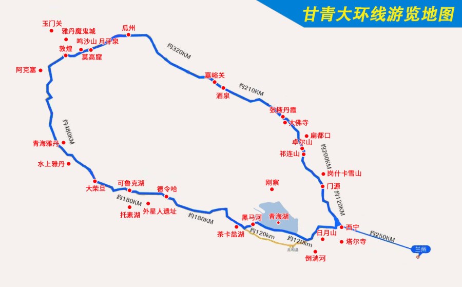 全程3000公里,用时12天,主要景点:张掖七彩丹霞、嘉峪关关城、莫高窟、月牙湾、青海湖、茶卡盐湖、塔尔寺。