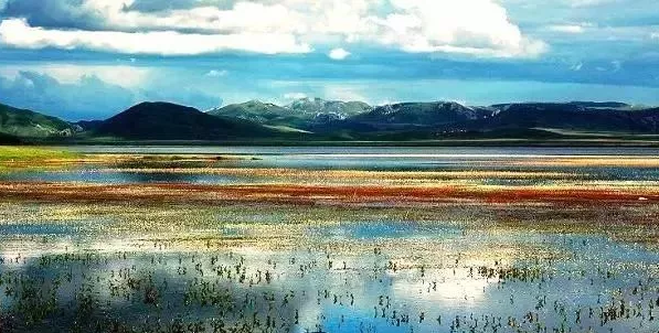 花湖是热尔大坝草原上的一个天然海子,七月中旬是花开的最盛的时候,沿着湖边的栈道行走,就能走到湿地中间去。如果有幸,还能在这里看到濒危保护动物黑颈鹤呢。
