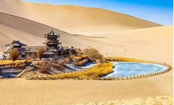 “晴空万里蔚蓝天,美绝人寰月牙泉。银山四面山环抱,一池清水绿漪涟!” 澄黄的鸣沙山和清澈的月牙泉泉水相互依存,那奇异迷人的景色延续千年不变。