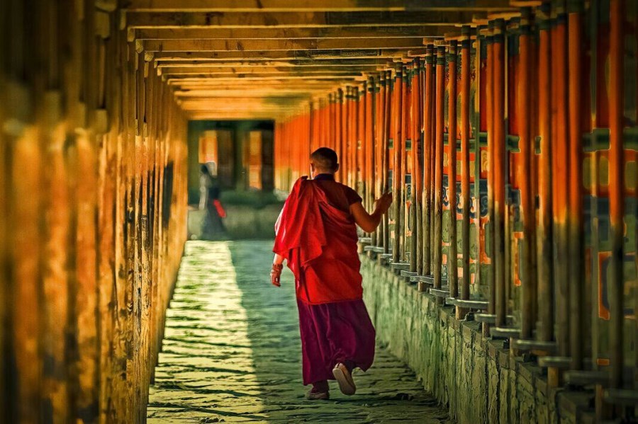 喇嘛在拉扑楞寺轻松自如,你在门左边,我在门右边,共守一把锁,同心协力开,马路边,红墙外,信誓旦旦永相伴,恒心不变,贡唐宝塔,金光闪闪铜质转转轮,纯手工打造游客和僧侣一起转经。站在贡唐宝塔最高处,拉扑楞寺尽收眼底。大桥上观贡唐宝塔,更是气势恢宏!站在东山顶上,鸟瞰拉扑楞寺全景。夜晚,一群牛人彻底的打破清规戒律,敞开酒囊,大喝一场!