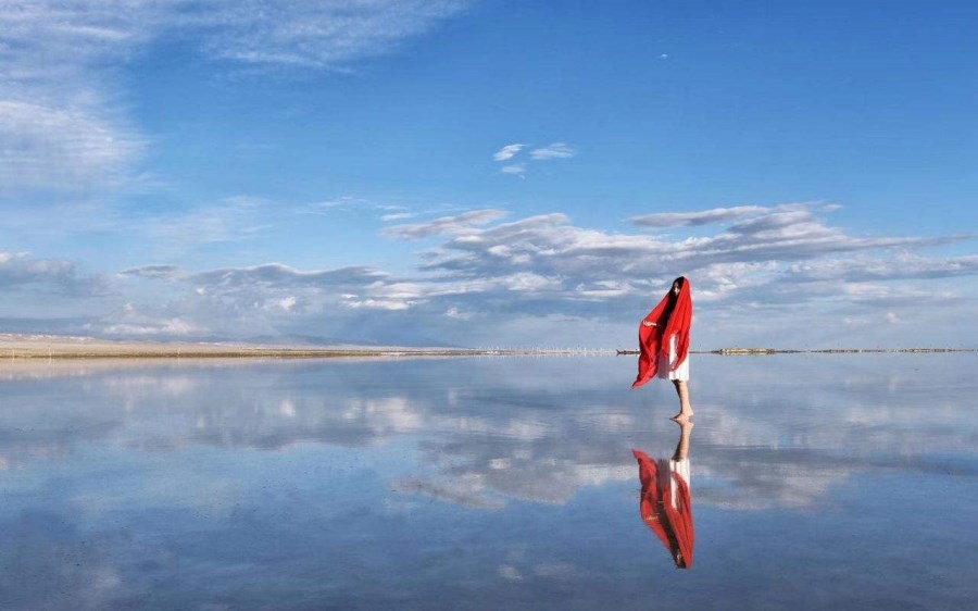 茶卡盐湖距离青海湖约151公里,海拔3100米,面积空旷、地势平坦。湖水中含大量固态盐,使湖面极具强烈的反射能力,就像是一面为天空梳洗打扮而准备的镜子,被称为中国的“天空之镜”,与青海湖、塔尔寺、孟达天池被称作“青海四大景”,被国家地理杂志评为“人一生必去的55个地方之一”