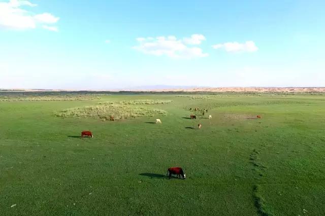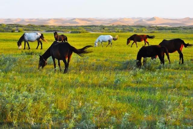 春季来临,成群的野鸭、遗鸥、灰鹤在茂盛的芦苇丛中自由地游弋,它们把这里当作北徙途中的一座驿站,优哉游哉,成为大漠风光中一道美丽的风景。一年四季,草原的颜色也会随着季节的更替而变化。春天,当第一茬嫩草破土而出的时候,草原是黄绿相间的杂色,像水墨写意画一般。