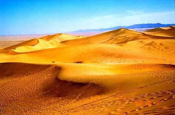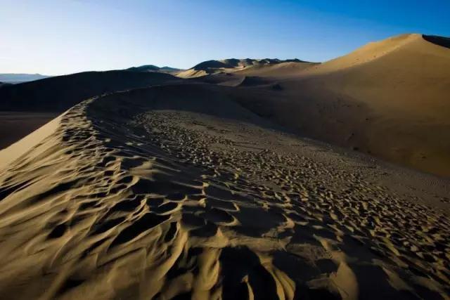 鸣沙山有两个奇特之处:人若从山顶下滑,脚下的沙子会呜呜作响;白天人们爬沙山留下的脚印,第二天竟会痕迹全无。