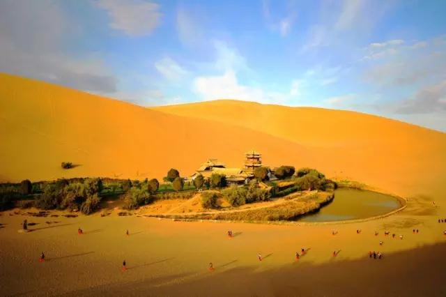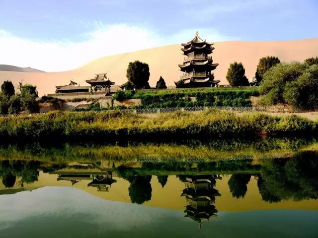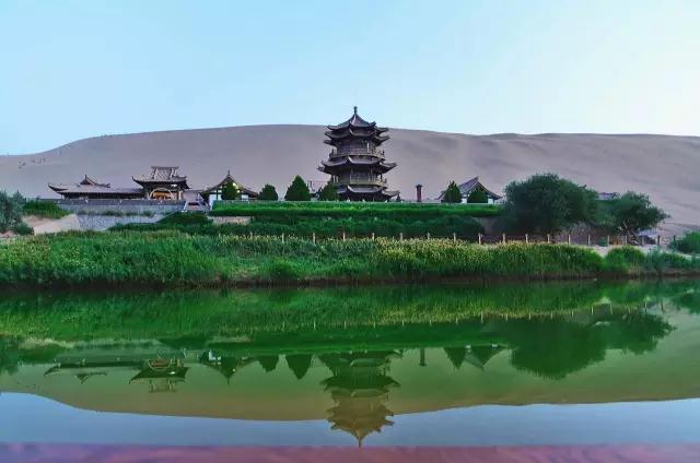 月牙泉在鸣沙山的怀抱中,形状酷似新月。因为处于鸣沙山中,多年来与沙漠共存未曾干枯也未被流沙淹没,堪称“天下奇观”。