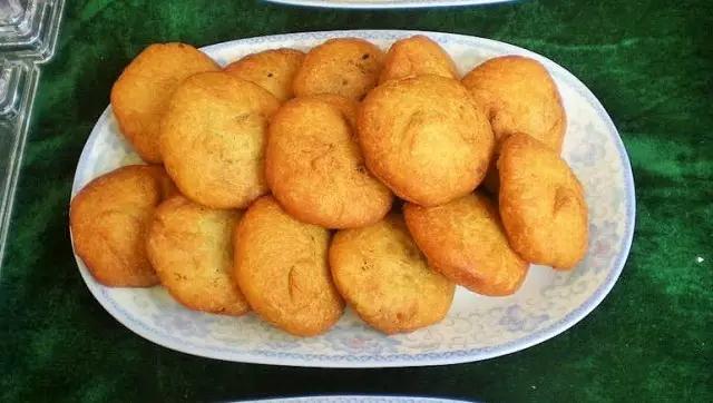 泡儿油糕是敦煌宾馆根据民间传统方法做出的一种风味小食,因其色泽黄亮,表面膨松如轻纱,结有密密麻麻的珍珠小泡,故而得名。
